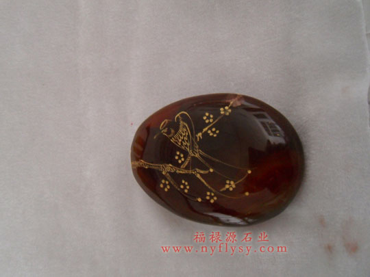 产品介绍:此款产品为红色玛瑙材质制作而成,采用微雕刻工艺,表面为山水花鸟图。