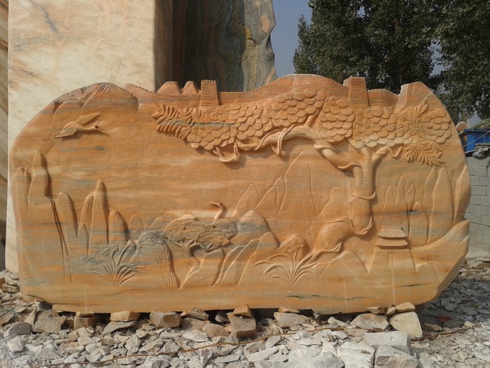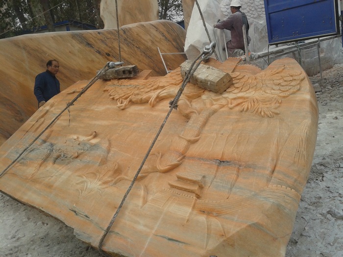 2013年11月9日,邯郸经销商在我公司定制长4米 高2米 厚0.4米 的晚霞红雕刻石 制作完成,并发货!